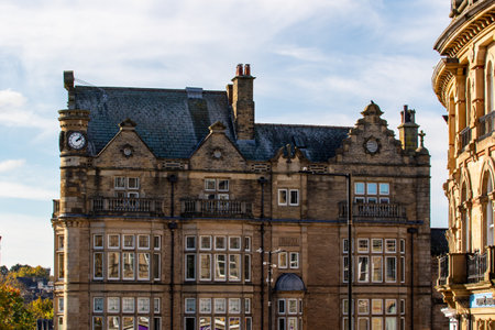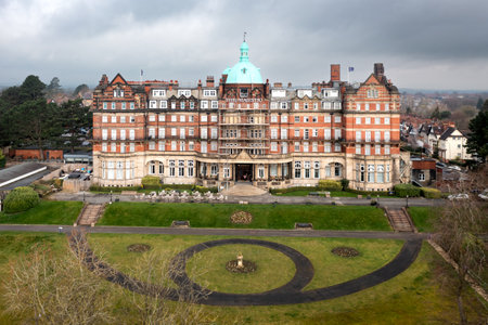 HARROGATE, UK - MARCH 18, 2023. An aerial view of the front facade of The Majestic hotel in Harrogate, North Yorkshire which is an example of Victorian architecture in the town
