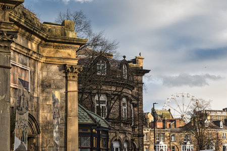 A view of aged stone buildings, one prominently displaying classical architectural details and banners, alongside a Ferris wheel in the background under a partly cloudy sky.