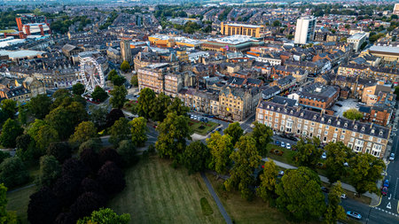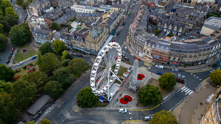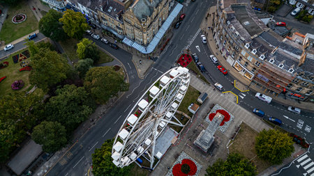 An aerial view of a city center featuring a Ferris wheel, numerous buildings, and a park with trees and grass in Harrogate, UK.