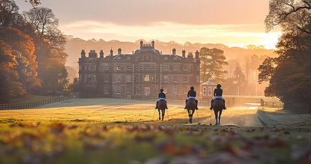 English Polo players are riding horses back to stables after a game at sunset. Beautiful English countryside landscape