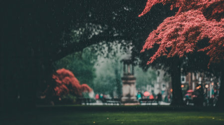 A moody, atmospheric shot of a public park at night. Dark silhouettes of trees with vibrant red leaves frame a blurry monument in the background, creating a mysterious and serene scene.