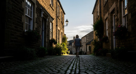 A person walks away down a narrow, charming cobblestone street lined with historic stone buildings. The soft, golden light suggests early morning or late afternoon in a picturesque European village.