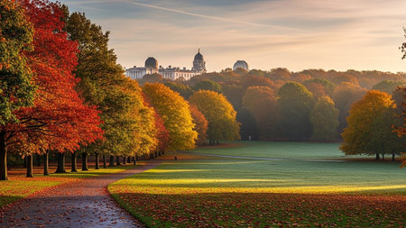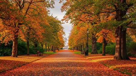 Tourists walking along a winding path in a park during autumn, enjoying the colorful foliage. AI generated image