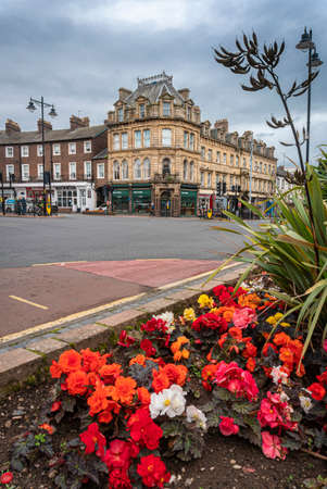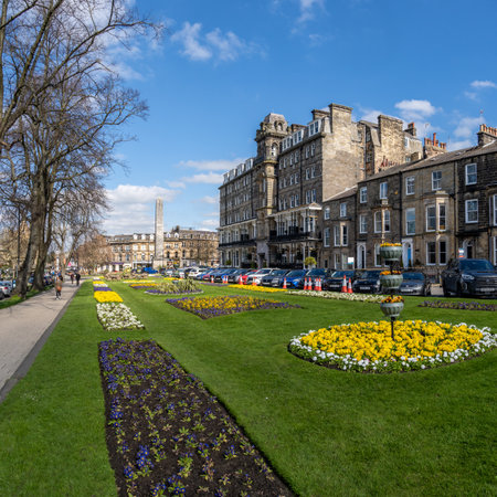 MONTPELLIER QUARTER, HARROGATE, UK - APRIL 15, 2023. Floral displays of colourful flower bed in landscaped gardens in the Harrogate in Bloom Springtime trail near the Montpellier Quarter