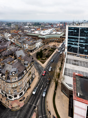 HARROGATE, UK - APRIL 15, 2023. An aerial cityscape of Harrogate town centre with the Victoria Shopping Centre and Victorian architecture mixed with modern buildings