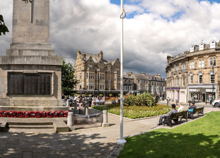 PROSPECT SQUARE, HARROGATE, UK - AUGUST 6, 2023. A panoramic exterior of the Victorian architecture of Prospect Square with the war memorial and Betty's Cafe and Tea Rooms in Harrogate, North Yorkshire