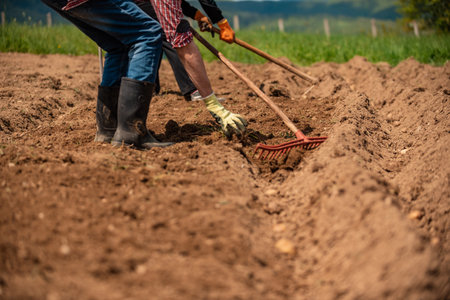 Furrows rows pattern in a plowed field prepared for planting potatoes crops in spring.