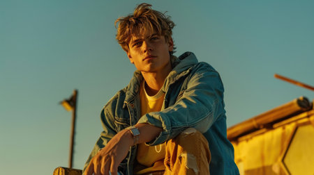 A young man sits confidently in a denim jacket, illuminated by the warm glow of a sunset. This image encapsulates youth, style, and an adventurous spirit.