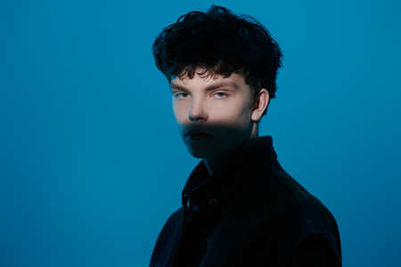 Handsome young man model with dark curly hair looks into the camera calmly and thoughtfully with a beam of light on his face. Studio portrait on a blue background with copy space. Emotions.