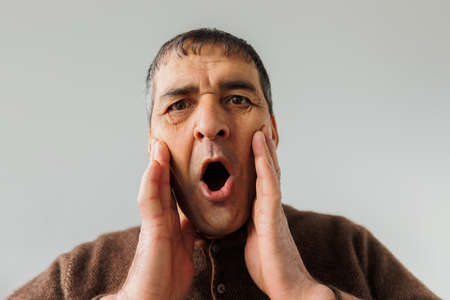shocked elderly man put hands on face and very surprised male puts his hands to his open mouth and looking at camera, People sincere emotions, on white background, studio footage