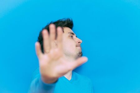 portrait emotional young man on blue background