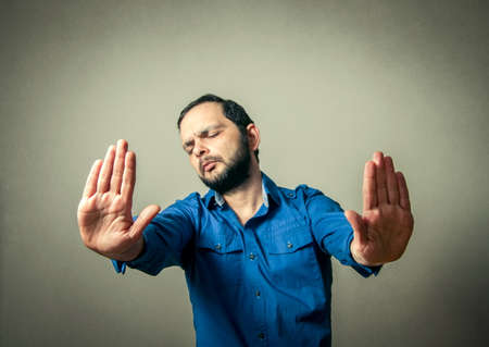 man with beard making stop sign
