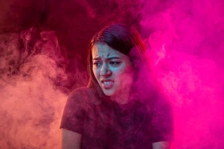 Childhood fear. Scared young dark hair woman with different emotions isolated over pink background with clouds of smoke. Concept of mental health
