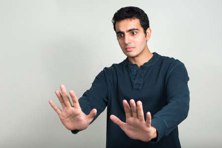 Portrait of young handsome Indian man against white background