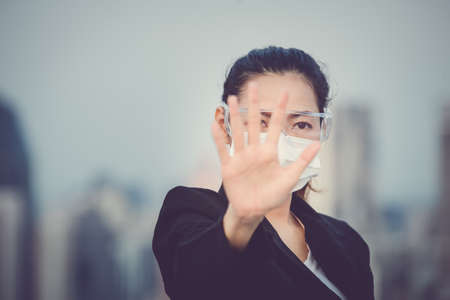 woman face mask and hand stop sign