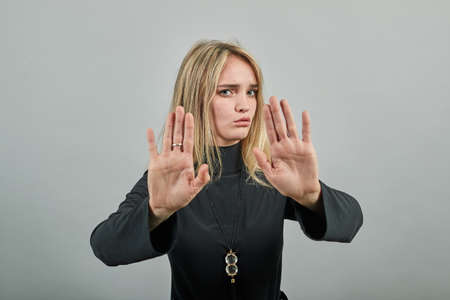 girl shutting out from view. private life and paparazzi concept. woman putting hands forward blocking unwanted attention. portrait of young woman on blue background.