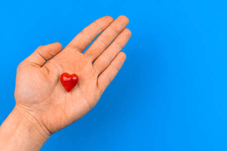 The concept of charity and love, helping hand with red heart on blue background