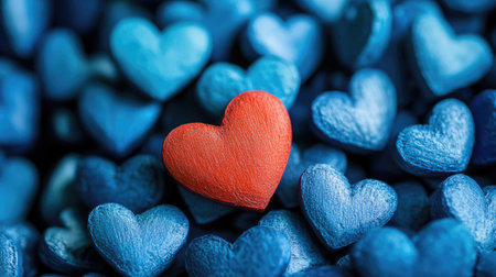 Contrast in love: A single vibrant red heart contrasting against multiple blue hearts,