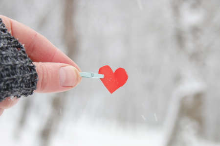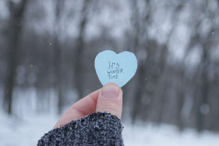 A hand holds a paper blue heart with the inscription Its winter time.