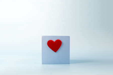 Abstract blue cube with a bright heart on a blue background of copy space. Podium in the form of a cube a place for text