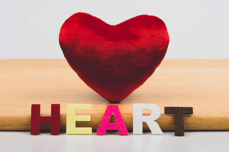 Red heart pillow on wooden floor for the concept of love.
