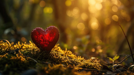 Red heart on green moss in the forest. Valentine's day background