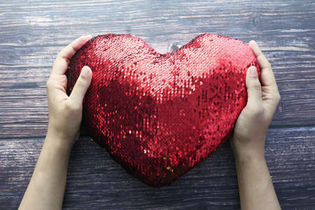 Closeup of a red heart in hands of woman on pink background