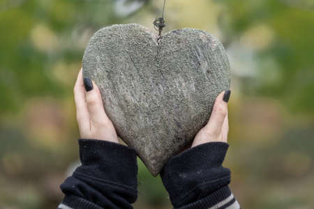 2 young female hands holding black fingernails holding a wooden heart up