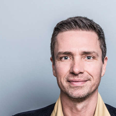 Close-up portrait of a smiling man, soft diffused light, solid background.