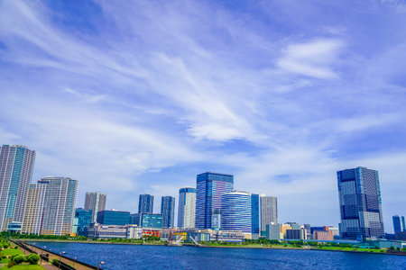 Beautiful landscape of architecture of famous modern Toyosu district Tokyo, Japan with Sumida river, travel background