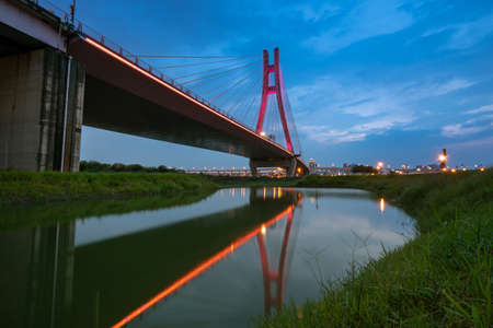 The sunset and the silhouette of the bridge piers. Zhongxing Bridge spans the Tamsui River and connects two cities. Taipei City.