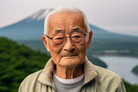 Portrait of senior asian man wearing eyeglasses with mountain Fuji background