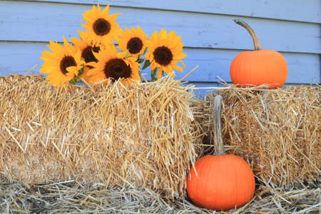 Decoration for Harvest and Thanksgiving from Bales of Hay, Bouquet Sunflowers and Orange Pumpkins with long stem in front of gray wooden wall