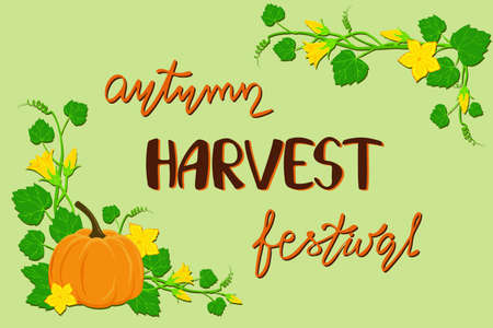 Pumpkin festival poster. Nice pumpkin plant with flowers and lettering for your design. Vector invitation for fest. Banner for fall harvest festival
