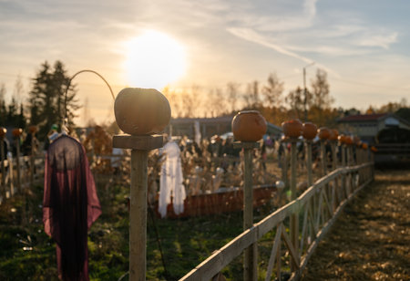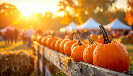 Halloween pumpkins on wooden fence at sunset in autumn field