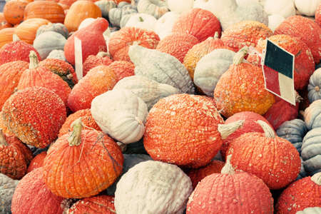 Autumn pumpkin background. Close up of mini pumpkins at farmers market.