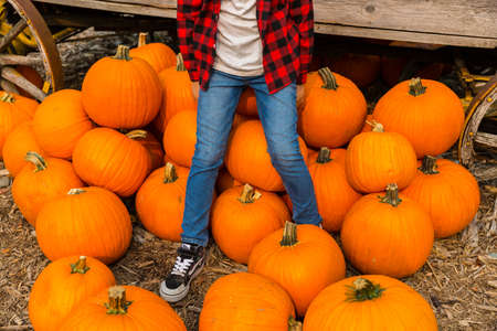 Autumn concept with pumpkins and woman in jeans and boots
