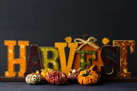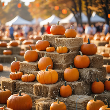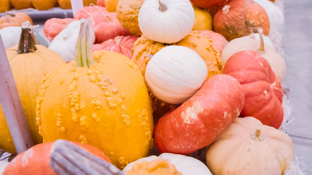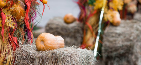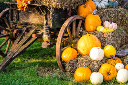 bright pumpkins on autumn farm festive harvest decoration background.