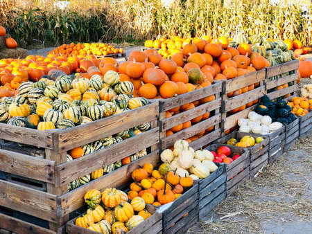 Different autumn shapes and kinds of pumpkins in wooden containers at farm house.