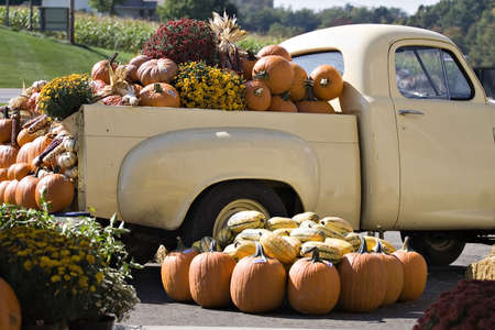 A vintage pickup truck heaped with fall ornamental flowers, corn, pumpkins and gourds.