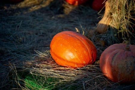 Pumpkin in the rays of the setting sun , lying in the manger. Harvest festival