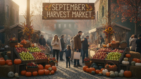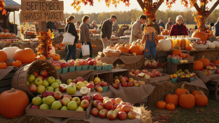 A bustling outdoor harvest market with people shopping for fresh produce and baked goods