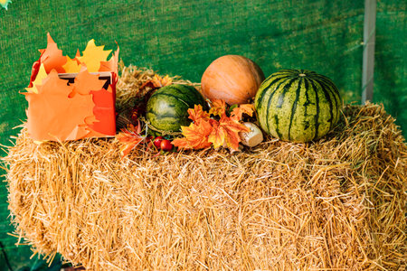 Watermelons, pumpkin and leaves lie on a stack of straw. Autumn composition