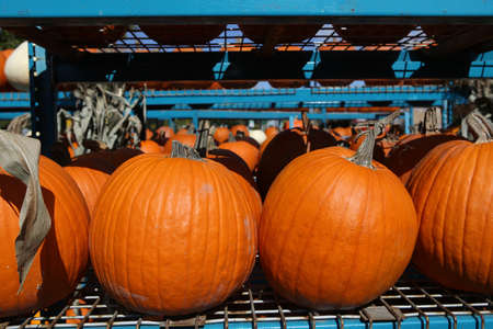 A row of fall orange pumpkins sitting on the ground at a fall festival at a local pumpkin patch