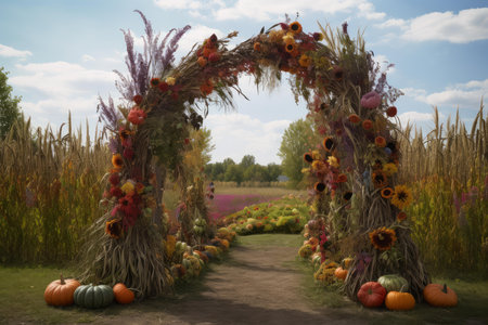 A vibrant display of pumpkins and corn at a rustic autumnal market stand