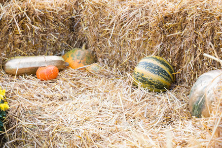Different pumpkins lie on a straw with copy space. Autumn composition with pumpkins.