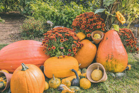 Pumpkins Halloween garden decoration and autumn chrysanthemum flowers. Close up, selective focus. Halloween and Thanksgiving natural DIY decoration for home and celebration concept