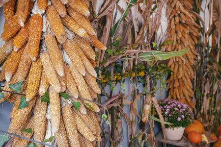 Halloween and Thanksgiving autumn decoration with dried corn cobs, pumpkins and autumn flowers. Vintage style. Selective focus, holiday concept