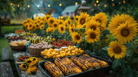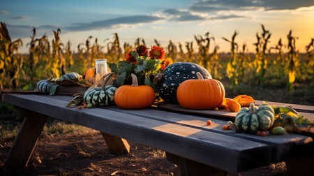 Photo of a wooden table top and on it pumpkins, in the background a field of corn sunset. Pumpkin as a dish of thanksgiving for the harvest. An atmosphere of joy and celebration.