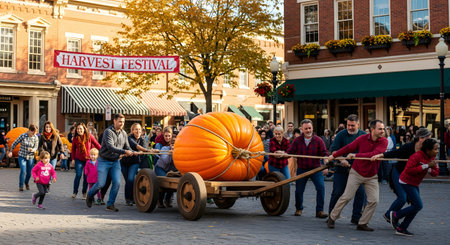 A vibrant autumnal scene at an outdoor festival with people and food stalls